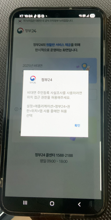 설정 → 애플리케이션 → 정부 24 → 권한 → 위치 → 앱 사용 중에만 허용 선택