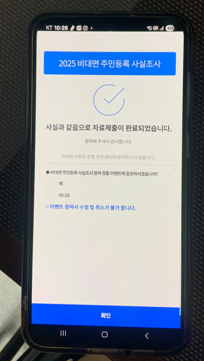 이렇게 위와 같이 간단하게 비대면 조사로 끝날 수 가 있습니다. 여러분들도 간단하게 주민등록 사실조사를 끝내보시죠!