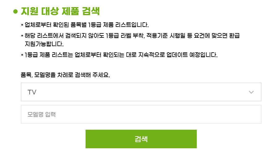 - 해당 리스트에서 검색되지 않아도 1등급 라벨 부착, 적용기준 시행일 등 요건에 맞으면 환급 지원 가능