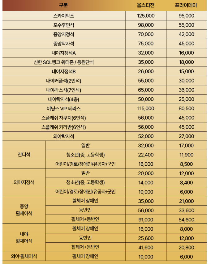 좌석은 일반석부터 프리미엄석까지 다양하게 구성되어 있으며, 가격은 다음과 같습니다 (예상 기준):